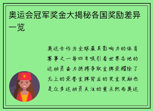 奥运会冠军奖金大揭秘各国奖励差异一览